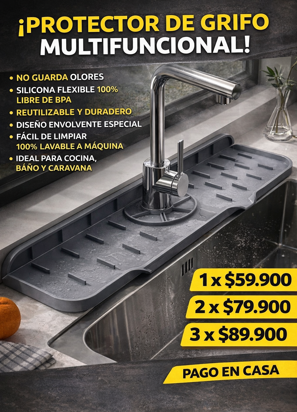 El Escurreplatos de Silicona para Fregadero es la solución práctica y moderna que está transformando miles de cocinas. Diseñado para colocarse directamente alrededor del grifo, permite que el agua escurra de forma natural hacia el fregadero, evitando charcos, humedad y suciedad. Su diseño flexible se adapta fácilmente a distintos tipos de grifos y fregaderos, permitiéndote escurrir platos, vasos, cubiertos, frutas o utensilios de cocina sin complicaciones. Además, su superficie antideslizante evita que los objetos se resbalen.