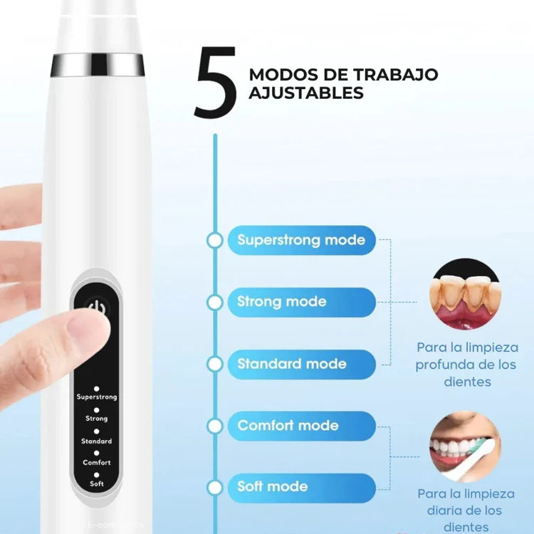 ✔️ Múltiples Modos de Limpieza Personalizados: Ofrece diferentes configuraciones (limpio, suave, pulido, etc.) para que puedas adaptar la intensidad a la sensibilidad de tus dientes y encías.