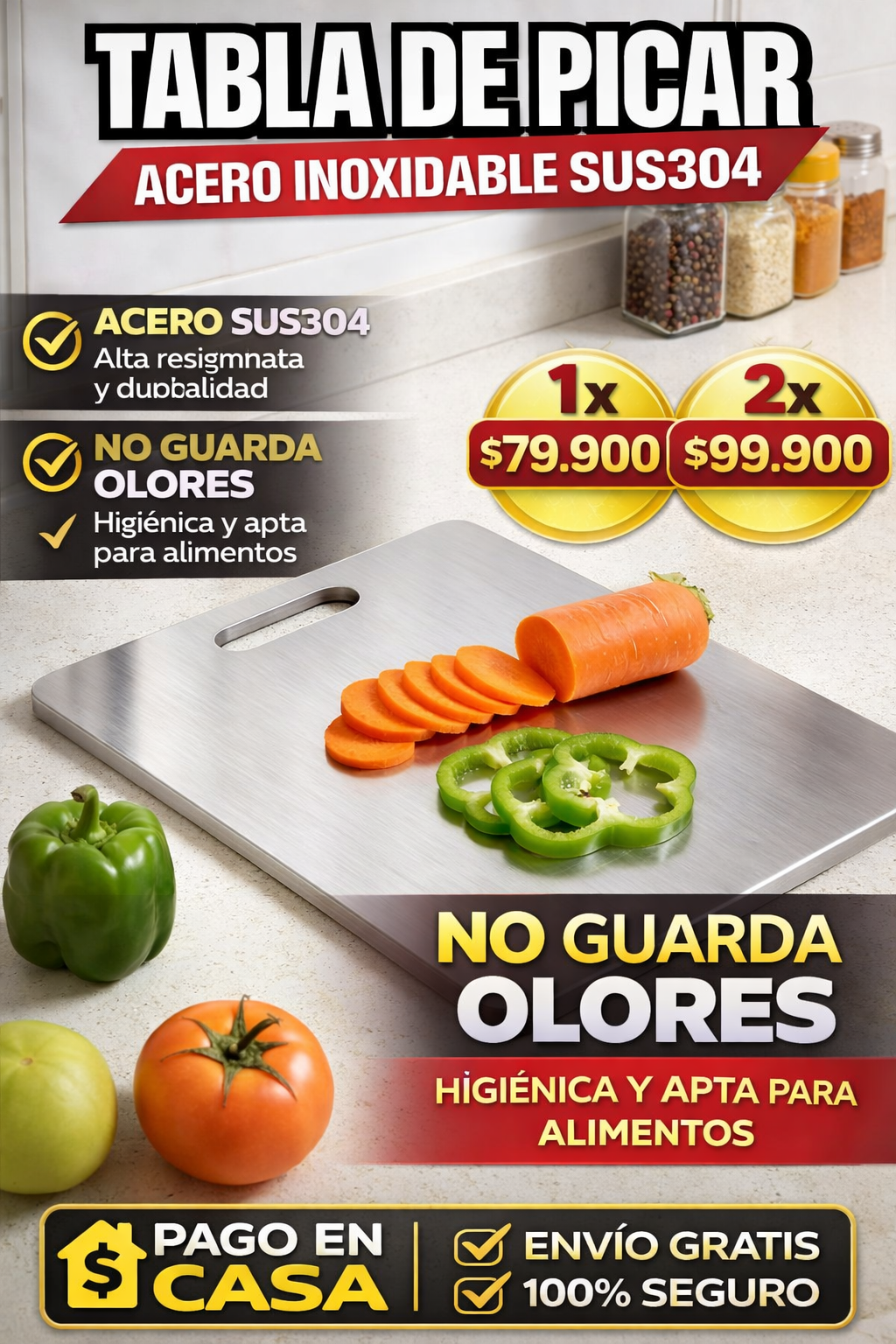 La Tabla de Picar de Acero Inoxidable SUS304 es la solución moderna y segura para tu cocina. Su material de grado alimenticio no poroso evita la acumulación de residuos, no guarda olores y se limpia fácilmente en segundos.